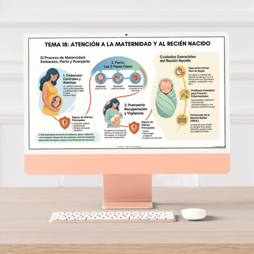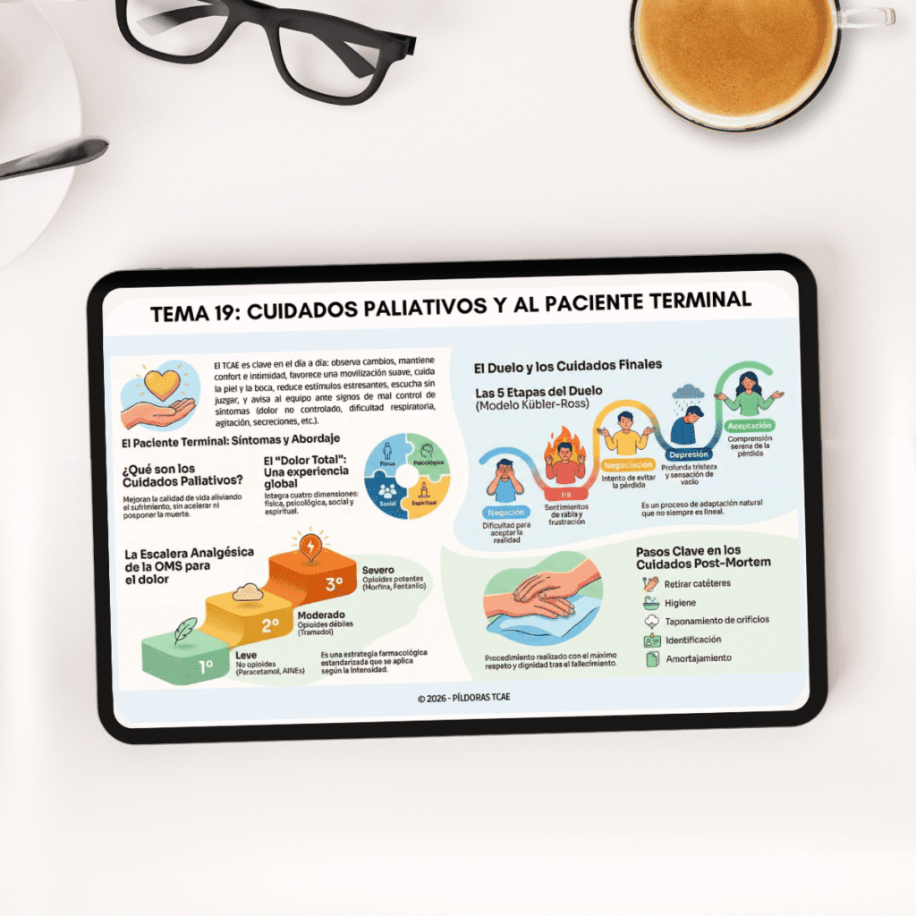 Recibirás una infografía detallada de cada uno de los 19 temas esenciales: desde Comunicación Sanitaria y Prevención de Riesgos, pasando por Higiene, Farmacología y RCP, hasta Cuidados Paliativos.